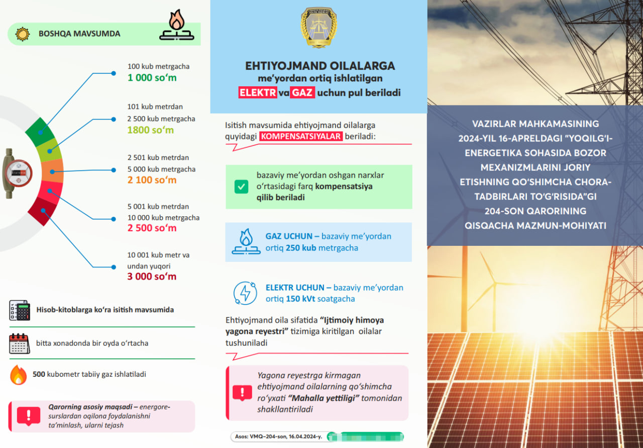 Tabiiy gaz va elektr energiyasi bo‘yicha kompensatsiya olish uchun kimga murojaat qilish kerak?5-05-2025, 12:26