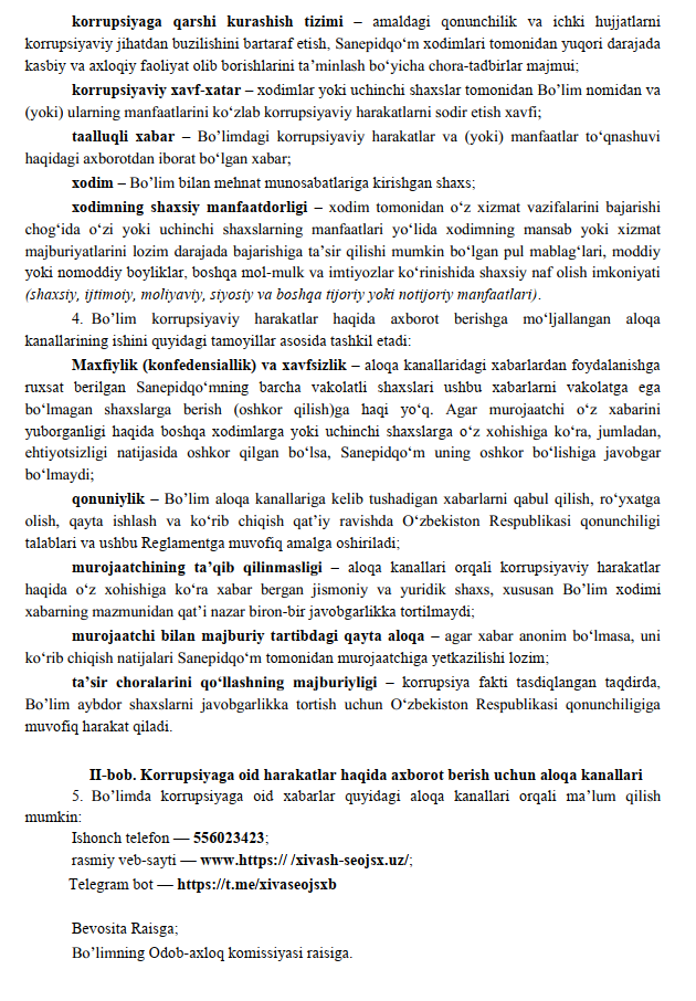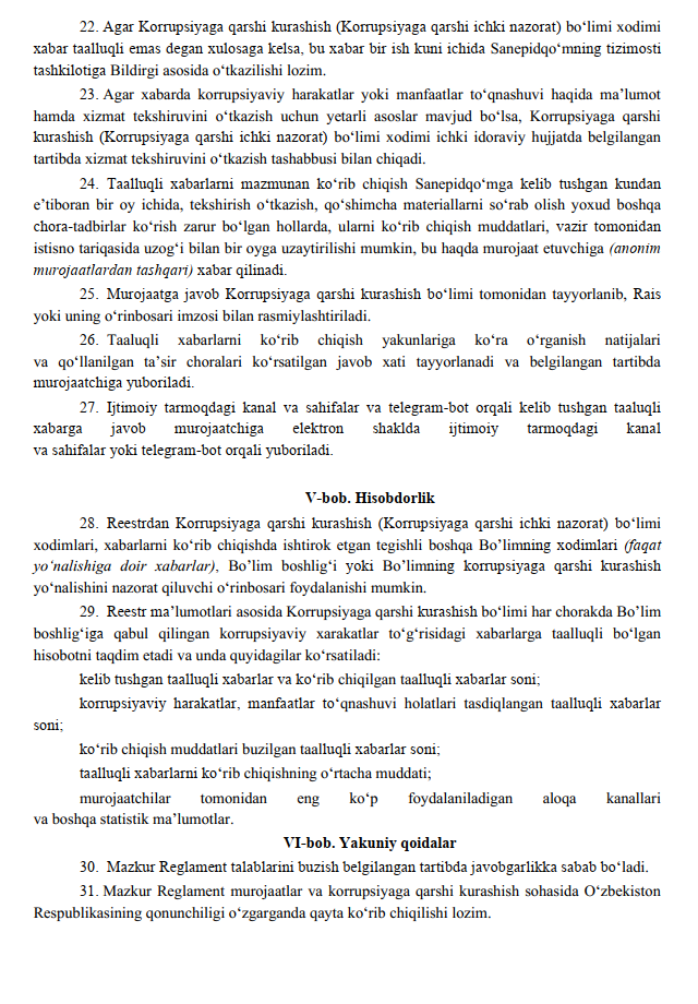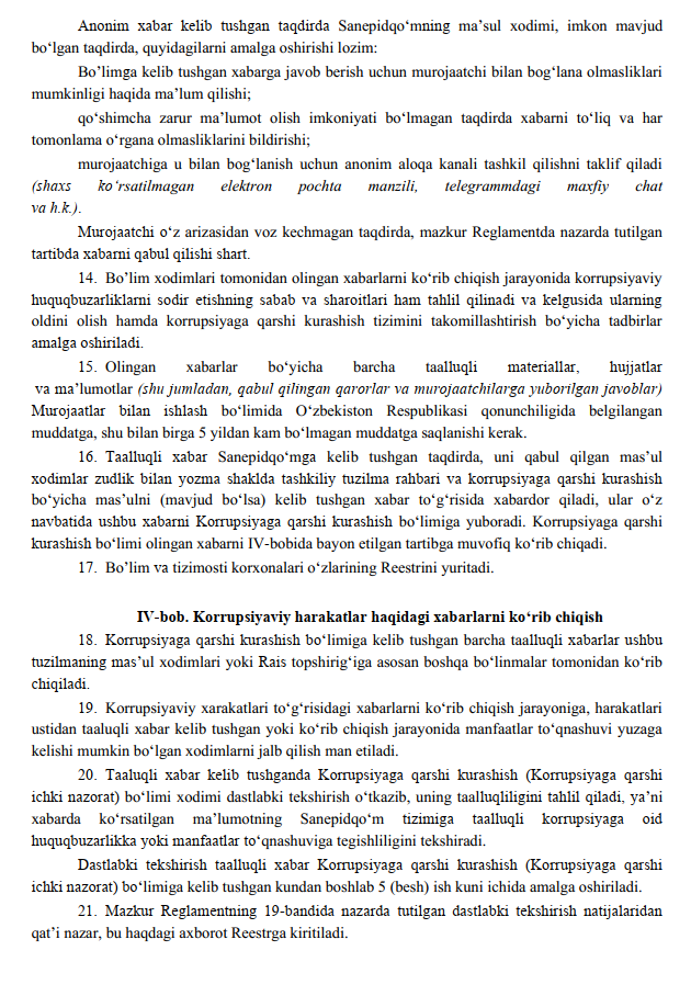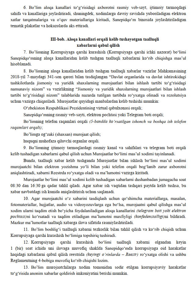 Korrupsiya to'g'risidagi kelib tushgan habarlarni Aloqa kanallarida ko'rish reglamenti14-06-2025, 15:07